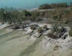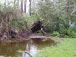 At Lake Harbor, a tiny lakefront community near the western boundary of Palm Beach County, only seven homes were left standing after the hurricane.[94] About 743 homes[91] – roughly 80% of the dwelling in South Bay – were damaged,[92] and 63 residences were destroyed.[91] The city hall and the fire station suffered heavy roof damage.[95] In Canal Point, trees, branches, power lines, and electrical poles were toppled. Almost complete destruction of the community's mobile homes parks occurred. Several other homes and buildings were inflicted with serious damage.[88] Overall, damage occurred at about 60% of homes in Canal Point.[93] Some historical buildings damaged by hurricanes Frances and Jeanne in 2004 were destroyed by Wilma.[96] State Road 80, one of the only routes between eastern and western Palm Beach County, was closed after a Florida Power & Light transmission line fell across the highway about 1 mi (1.6 km) west of Lion Country Safari.[90] At the Loxahatchee National Wildlife Refuge (NWR), 85% of tree islands – "small, wetland forest communities imbedded in a matrix of freshwater marsh" – were damaged by the storm. Less than 50% of the canopies were removed at most tree islands, while the tree islands that suffered the worst impact had larger trees and were near the center of Loxahatchee NWR.[97] The office and visitor centers were both severely damaged and later rebuilt.[98]
