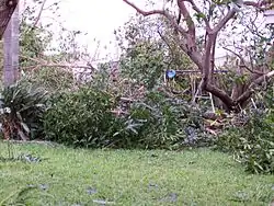 A man in the unincorporated community of Loxahatchee died after he was crushed by a tree that pushed him into the windshield of his vehicle.[99] The metal roof at Western Pines Middle School was peeled back, exposing multiple classrooms.[100] In nearby Royal Palm Beach, 331 homes were impacted.[91] Damage there reached about $9 million, including about $1.5 million to village property.[101] The village of Wellington suffered severe damage. The community center nearly lost its roof, the bleachers around the pool collapsed, and fences and canopies surrounding the tennis courts were destroyed. A few local parks experienced similar effects to their bleachers and sports facilities.[102] Palm Beach Central High School was severely damaged. Its kitchen and cafeteria lost portions of their roof, the theater and media center were flooded, the gym suffered a roof leak, and trees, signs, and fences were knocked down throughout campus.[103] Many trees and utility poles were snapped at The Mall at Wellington Green.[90] Approximately 3,955 homes were impacted and 4 others destroyed.[91] Overall, Wellington suffered almost $62 million in damage, with $50.4 million to property, and $3.8 million to public facilities, with repairs costs reaching almost $5.9 million.[104]
