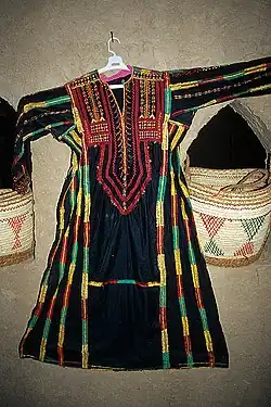 In Bani 'Adi, the traditional dress is a very large T shaped robe of dark blue fabric. The neck opening and seams are embroidered with red cotton or acrylic thread, and additional lines of embroidery decorate the sleeves and sides.[46]