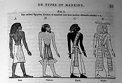 Illustration from Types of Mankind (1854), which shows a copy of an Egyptian wall painting used to show that there were different 'types' (or 'species') of humans as far back as ancient Egypt. Types uses this as support for its theory of polygenesis.