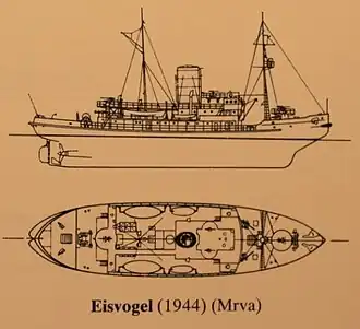 The ship was built for the navy in Aalborg Shipyard in Denmark, which has been occupied by Germany since April 1940,[2] as a modified ship of the Eisbär under construction on Eriksbergs Mekaniska Verkstad in Gothenburg, Sweden. It was launched in 1942 and entered service on June 1, 1942. The ship was 61.40 m long and 15.30 m wide, had a draft of 5.90 / 6.30 m and a water displacement of 2090 t (standard) and 2913 t (fully equipped). Two standing triple expansion steam engines with a total of 3200 psi gave a top speed of 12.5 knots over two screws. The armament consisted of two 3.7 cm Flak 37 in single mounts. The crew consisted of 69 men.