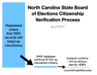 Also, due to timing issues and the fact that DMV data is generally updated only when licenses are issued, DMV data alone is not reliable for this purpose either...If SAVE indicates a voter is a non-citizen, NCSBE opens a case file and attempts to contact the voter to determine citizenship status through mailings and interviews. Because of the unreliability of citizenship data, voters who appear to be non-citizens – where both data sources indicate non-citizenship status – are not removed from the rolls, absent independent confirmation that they are not citizens. In fact, approximately three-quarters of those who subsequently provide proof of U.S. citizenship continued to appear as non-citizens in the SAVE database.