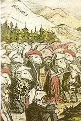 None of the works consulted attempts to define a social profile of the Carlist electorate, be it in terms of sex, age, education, occupation, residence or any other feature.[64] Some approximation is offered by electoral studies dedicated to specific areas – not necessarily representative for the entire Spain[65] – and by works providing social analysis of Carlism at the outbreak of the Civil War.[66] Both types of analysis suggest that Carlism was generally a heterogeneous, inter-class movement; some scholars claim that it was "el movimiento de derechas más interclasista de Epaña".[67] However, it enjoyed popular particularly in rural milieu of small towns and villages rather than in major urban centers; only 3 mandates were obtained by the Carlists in a strictly urban constituency of a large city.[68] Many scholars note also that implantation of Carlism was not equal in all rural areas; it was small- and mid-size farmers rather than landless rural proletariat who were particularly attracted.[69]