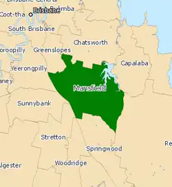 The district is based in the south-eastern suburbs of Brisbane. It is named for the suburb of Mansfield and also includes the suburbs of Burbank, Rochedale and Wishart. The electorate was first created for the 1972 election.