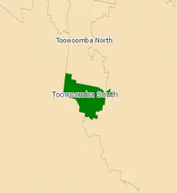 Toowoomba South is an electoral district of the Legislative Assembly in the Australian state of Queensland. It was created with the 1972 redistribution, and replaced the abolished Toowoomba East.[1]
