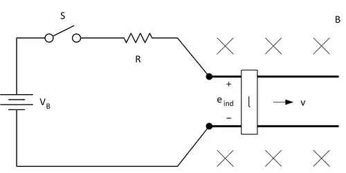 The machine can be started by closing switch , which forms a closed electric circuit. From equation (3) the current supplied can be determined, however as the bar is not moving yet the induced voltage and the starting current is determined only by the series resistance .
