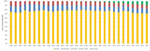 The electricity sector in France is dominated by its nuclear power, which accounted for 71.7% of total production in 2018, while renewables and fossil fuels accounted for 21.3% and 7.1%, respectively[1] (compare to 72.3% nuclear, 17.8% renewables and 8.6% fossil fuels in 2016).[2] France has the largest share of nuclear electricity in the world, and together with renewable energy supplies, this has helped its grid achieve very low carbon intensity.