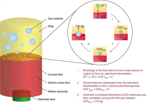 In electrorefining, decarburization process happened in electrochemical cell that composed of inert electrode, slag and steel. During the process, current passing through the cell and made slag and steel melted. Oxygen ion from slag decompose and oxidize carbon on steel and to form CO. That decarburizing reaction occurs in three steps as follows:[7]