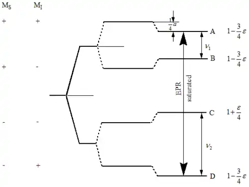 The right figure illustrates the energy diagram of the simplest spin system where a is the isotropic hyperfine coupling constant in hertz (Hz). This diagram indicates the electron Zeeman, nuclear Zeeman and hyperfine splittings. In a steady state ENDOR experiment, an EPR transition (A, D), called the observer, is partly saturated by microwave radiation of amplitude while a driving radio frequency (rf) field of amplitude , called the pump, induces nuclear transitions.[5] Transitions happen at frequencies and and obey the NMR selection rules and . It is these NMR transitions that are detected by ENDOR via the intensity changes to the simultaneously irradiated EPR transition. Both the hyperfine coupling constant (a) and the nuclear Larmor frequencies () are determined when using the ENDOR method.[6]