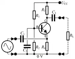 A circuit diagram representing an analog circuit, in this case a simple amplifier