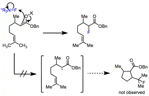 On the other hand, the lifetime of radicals in the SET process is predicted to be four orders of magnitude shorter than the detection limit of even the most sensitive of radical probes. It has been postulated that after electron transfer, immediate recombination of the fluorine radical with the alkyl radical takes place.[5]