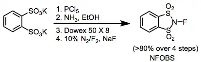 Electrophilic N-F fluorinating reagents incorporate electron-withdrawing groups attached to nitrogen to decrease the electron density on fluorine. Although N-fluorosulfonamides are fairly weak fluorinating reagents, N-fluorosulfonimides, such as N-fluorobenzenesulfonimide (NFSI), are very effective and in common use. N-fluoro-o-benzenedisulfonimide (NFOBS) is synthesized from the disulfonic acid.[2]