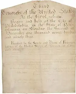 The Eleventh Amendment was proposed by the 3rd Congress on March 4, 1794, when it was approved by the House of Representatives by vote of 81–9,[3] having been previously passed by the Senate, 23–2, on January 14, 1794.[4] The amendment was ratified by the state legislatures of the following states:[5]
