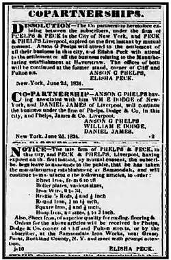 Peck's association with Anson G. Phelps laid the foundation for the creation of Phelps, Dodge & Co., a business that became the dominant importers of metals into America, and the dominant exporters of tin-plate from Britain for half a century. The company eventually became one of the largest copper mining and copper producing concerns in the world.[19]