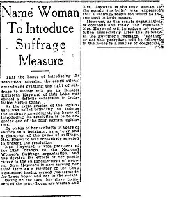 - ^ "Name Woman to Introduce Suffrage Measure". Salt Lake Telegram. September 29, 1919. p. 5. Retrieved 2014-11-24.