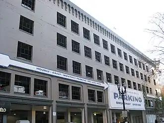 The Corbett Brothers Auto Storage Garage (Broadway Garage), designed by A. E. Doyle. Completed in 1925. It was Portland's first self-service ramp garage. Access was off Pine Street. Store fronts were located on Sixth, Broadway and Pine. It is built in reinforced concrete. Alterations were made for the Corbetts by Pietro Belluschi in 1948. Listed on The National Register of Historic Places.[55]