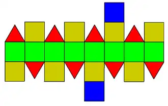 The elongated square gyrobicupola can be constructed similarly to the rhombicuboctahedron, by attaching two regular square cupolas onto the bases of an octagonal prism, a process known as elongation. The difference between these two polyhedrons is that one of the two square cupolas is twisted by 45 degrees, a process known as gyration, making the triangular faces staggered vertically.[3][1] The resulting polyhedron has 8 equilateral triangles and 18 squares.[3] A convex polyhedron in which all of the faces are regular polygons is a Johnson solid, and the elongated square gyrobicupola is among them, enumerated as the 37th Johnson solid .[4]