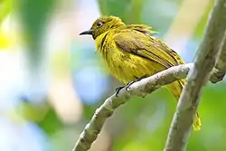 The Andaman flowerpecker is a little-known flowerpecker that is native to and found abundantly on the Andamans. It and the Nilgiri flowerpecker were considered part of the plain flowerpecker but was split due to slight differences in plumage and voice. It is found in slightly wooded areas. Due to its recent split from the plain flowerpecker, this species has not been assessed by the IUCN but is not expected to be threatened.[56]