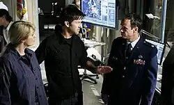 "Enemy at the Gate" is the 100th and final episode of the science fiction television series Stargate Atlantis. The episode aired on January 9, 2009 on the Sci Fi Channel in the United States, and on January 13, 2009 on Sky1 in the United Kingdom. Written by Joseph Mallozzi and Paul Mullie as their fifth and final script in the fifth season, "Enemy at the Gate" was produced as the nineteenth episode of the season and was directed by Andy Mikita. It is dedicated to Don S. Davis (Stargate SG-1's George Hammond), who died from a heart attack in 2008.