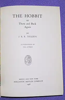 Hammond & Anderson refer to these variations as "states" within the "first printing", and recorded only two: one with the bowing hobbit on the title page, and one with the seated flautist.[1] Houghton Mifflin's practice was to place the publication year at the foot of the title page for the first printings of its first editions. All first edition Hobbit copies, of all variations, with or without the bowing hobbit of the first printing, show "1938" as the date on the title page, perhaps discouraging bibliographers from ascribing different printings to them.