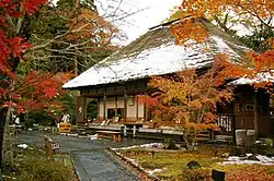 The Main Hall has a thatched hip roof and is named the Daihitei (大悲亭, lit. Great Sadness Cottage). It was dismantled and moved from Edo. Inside is enshrined a Muromachi period statue of Kannon seated on a lotus throne. Made of Japanese cypress using the yoseki-zukuri technique, it is gilded over lacquer.[1][2]