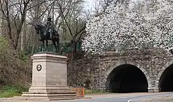 Following Grant's death, the Fairmount Park Art Association in Philadelphia, Pennsylvania began to fundraise for the creation of a monument honoring Grant in the city's Fairmount Park. By March 1886, the association had raised $12,153.56, which by 1893 had grown to $23,450.50. Additionally, the Philadelphia City Council provided $9,000 in additional funding. Following this, the association accepted proposals from various American sculptors, ultimately selecting Daniel Chester French and Edward Clark Potter to design an equestrian statue of Grant, with French designing the sculpture of Grant and Potter designing the horse. They were officially commissioned on January 23, 1894.[12] The statue was cast by the Bureau Brothers Foundry in Philadelphia,[13] with the statue's pedestal designed by Frank Miles Day & Brother.[14] The total cost for the construction of the monument was $32,675.35.[14]