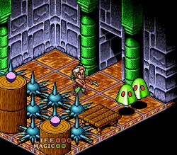 The isometric perspective results in artifacts in terms of distances between sprites. Some critics viewed this as optical illusions intended to test the player, but others criticized it as a technical flaw.[e] Detractors wrote the issue was especially noticeable with the collision detection of enemies, joking that the foes were surrounded by a big invisible forcefield of death.[3][11][33][34] Frank of Super Action reported the unclear perspective caused jumps to be incredibly hard, especially those that require Glendaal to be on the edge of a platform; in these situations, the player would need "almost supernatural depth perception", where the sprite would appear to float next to a platform when actually on the edge.[4] Game Power suggested the unclear perspective was a result of a lack of shadows.[9]