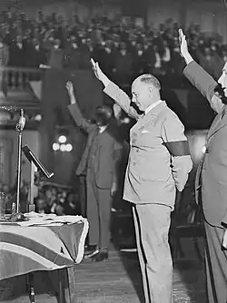 Campbell placed himself as commander of the New Guard and mass recruitment began in April 1931, using the ideology Campbell had drafted as attestation papers to be signed by all New Guardsmen. Efficient military-style recruiting methods were employed, with district units divided into localities and locality organisers and committees appointed to oversee local recruitment efforts. Rolls were compiled and maintained, and copies sent to headquarters, showing evidence of attendance at locality meetings and New Guard rallies.[53] By May 1931 the New Guard claimed to have "membership of many thousands of responsible citizens", holding meetings "in every locality throughout the suburbs".[54]