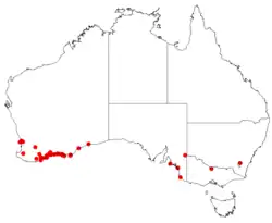 Coastal moort is found along the west and south coast of Western Australia, as far north as around Perth with the bulk of the population between Fitzgerald River National Park then east to around Esperance with scattered populations found further east. Populations are also found on islands in the Recherche Archipelago including Middle and Mondrain Island. It grows in a variety of habitats, including on sand dunes, on and around granite hills, and near swamps and estuaries, growing in sandy or clay soils. It is native in parts of its range and naturalised elsewhere.[2][4]