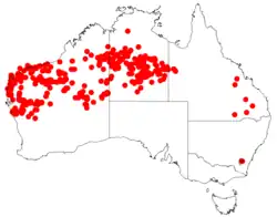 The smooth-barked coolibah is found on flats and flood plains in the Mid West, Pilbara, Kimberley and north eastern Goldfields-Esperance regions of Western Australia where it grows in sandy-loamy or clay-sand soils.[5] It is also found through much of the Northern Territory and in far western Queensland.[9]