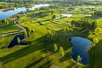 The golf club was established in 2005 next to the geographical midpoint of Europe. During the winter the golf club becomes a 5 km cross-country skiing track.[1]