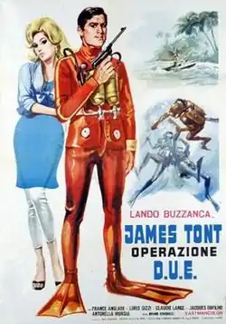 Director Bruno Corbucci's James Tont series starring Lando Buzzanca[11] is the earliest Italian comedy series based on 007. James Tont operazione U.N.O. (1965) features a female character named "Goldsinger" and underwater sequences that echo Thunderball. This was quickly followed by the sequel James Tont operazione D.U.E. a.k.a. The Wacky World of James Tont (1965). Corbucci also wrote the screenplays for Kiss Kiss...Bang Bang (1966) and the Derek Flint parody Il vostro super agente Flit (1966). Another Bond spoof, Two Mafiosi Against Goldfinger, also known as The Amazing Dr. G (1965), features Fernando Rey as a criminal mastermind named Goldginger.