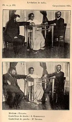 Professors Gustave Le Bon and Albert Dastre of Paris University examined Palladino in 1906 and concluded that she was a cheat. They installed a secret lamp behind Palladino and, at a séance, saw her release and use her foot.[34] In 1907, Palladino was found using a strand of her hair to move an object toward herself and it was noted by investigators that the objects were not outside of her easy reach.[35]