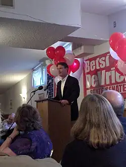 The Democratic takeover of Congress during the 2006 Mid-term elections was a victory for Bayh, who had helped three Iowan congressional candidates win their races during campaigning, and whose efforts culminated in a Democratic majority in the state's legislature.[42] In regards to the election, he stated that "we (the Democrats) won by turning the red states of the heartland blue".[43] In mid-November, the candidate traveled to the West Coast for a fundraising tour.[44] Late in the month, polls revealed that Bayh had a 43.3% likability rating among the American public, slightly ahead of the last placed finisher John Kerry at 39.6%.[45]