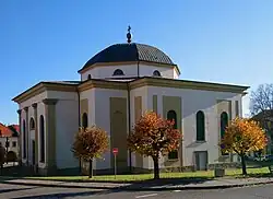 The church's architect was Anton Povolný, who also designed the town's County Hall (Župný dom) (constructed 1802–1822), both in a Neoclassical style. The format of the church is a Greek cross, surmounted by a dome.[2] There are two pipe organs, a Baroque organ from the first church and a larger modern instrument. The large painting above the altar, of Christ walking on the water, was painted by Jozef Czauczic.[1] THe church maintains an extensive historic library.[3]
