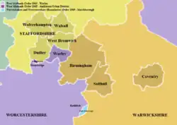 A gradual divergence was taking place with the city and towns of the county. Worcester was largely autonomous, but the city became a county corporate in 1622, thus regarded as separate from Worcestershire.[44] The larger towns were granted borough status from 1307 to 1660 (Bewdley, Pershore, Kidderminster, Droitwich and Evesham) and were largely confirmed as municipal boroughs from 1835 onwards, with Dudley (a manorial borough[45]) following suit in 1865.[46] Most of the hundreds were too cumbersome to administer and were split into 'Divisions', usually found in differing parts of the county. As the table below and Fig 2 show, some of these parishes were islands surrounded by other hundreds. A few parishes stretched over the county boundary as part of their contiguous area; Old Swinford parish included Amblecote from Staffordshire for instance.[47] By the 19th century the Industrial Revolution started a process of economic, social and physical integration of some Worcestershire towns and villages, with neighbouring communities in Staffordshire, thus creating the urban area known as The Black Country.[48] In 1844, following enactment of the Counties (Detached Parts) Act 1844, Halesowen and Oldbury were reunited with Worcestershire.[49]