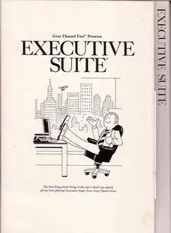 Executive Suite is a text-based business simulation game published in 1982 as a self-booting disk for IBM PC compatibles. It was developed by Armonk Corporation, a small software development company based in Newport Beach, California, and was published under their "Gray Flannel Fun" label.[3] Unlike most other business simulations, it does not involve making actual economic decisions or managing stores of resources. Rather, the player must manage the trajectory of their character's career at a single fictional corporation, MMC (Mighty Microcomputer Corporation), by making a series of on-the-job and managerial decisions while navigating office politics, evading blame for bad outcomes, and gaining support in different roles throughout the company.