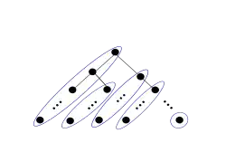 To reason about the recursion tree let the left child problem be the subproblem in the recursive call in step 3 and the right child problem be the subproblem in the recursive call in step 5. Count the total number of edges in the original problem and all subproblems by counting the number of edges in each left path of the tree. A left path begins at either a right child or the root and includes all nodes reachable through a path of left children. The left paths of a binary tree are shown circled in blue in the diagram on the right.