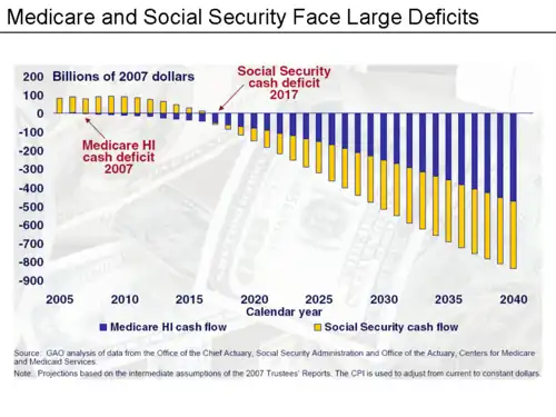 In the long-run, expenditures related to Social Security, Medicare, and Medicaid are growing considerably faster than the economy overall as the population matures.[6][7] The Congressional Budget Office (CBO) estimates that Social Security spending will rise from 4.8% of GDP in 2009 to 6.2% of GDP by 2035, where it will stabilize. However, the CBO expects Medicare and Medicaid to continue growing, rising from 5.3% GDP in 2009 to 10.0% in 2035 and 19.0% by 2082. CBO has indicated healthcare spending per beneficiary is the primary long-term fiscal challenge.[8][9] Further, multiple government and private sources have indicated the overall expenditure path is unsustainable.[10][11][12]
