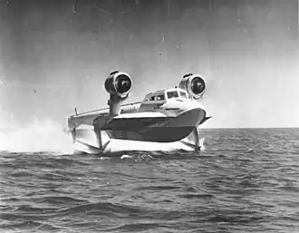 The XCH-4 employed three struts with "ladder" type hydrofoils. The foils were swept back approximately 45 degrees and have considerable dihedral providing a very stable ride even in moderately rough seas. The design eliminated drag inducing water propeller drive systems in favor of aircraft type propellers powered by two Pratt & Whitney R-985 Wasp Junior radial engines and in 1955 the vessel set a world speed record 78 knots.[3][4]