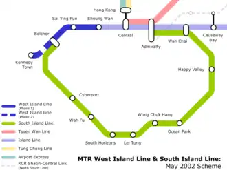 The MTR Corporation Limited (MTRC) submitted its first proposal for the West Island line in May 2002. This was similar to the final alignment, with stations at Sai Ying Pun, Belcher and Kennedy Town. In revisions in 2003 and 2004, the West Island line became its own line, which would interchange with the Island line at Sheung Wan or Sai Ying Pun. On 28 May 2004, planning for the line was deferred.