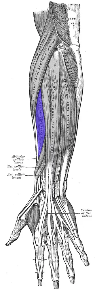 ![]() Posterior surface of the left forearm. Superficial muscles. The partially obscured extensor carpi radialis brevis is shown in blue. | |