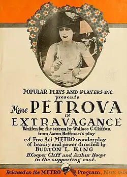 Extravagance is a 1916 silent film comedy drama directed by Burton L. King and based on a play by Aaron Hoffman. It stars Olga Petrova sometimes billed as Madame Olga Petrova. Produced by Popular Plays and Players, it was distributed through Metro Pictures.[1]