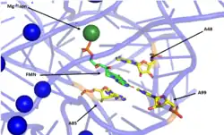 In the bacterium Fusobacterium nucleatum, FMN binding has been studied. The FMN riboswitch is able to selectively bind the FMN molecule due to several distinct nucleic acid residues, as well as some of the magnesium ions present in the overall riboswitch structure. FMN's planar isoalloxazine ring system intercalates between A48 and A85 residues on the riboswitch, thereby providing a continuous stacking alignment. Further, the uracil-like edge of the ring system forms specific Watson–Crick-like hydrogen bonds with a highly conserved A99 residue on the riboswitch.[6] An additional structural moiety of FMN, the ribityl group, uses one of its four oxygens for hydrogen bonding, whereas phosphate oxygens form additional hydrogen bonds with Watson–Crick edges of several conserved guanines.[7] The interaction between the phosphate of FMN and the RNA is also bridged by a magnesium ion, which directly coordinates the phosphate oxygen of FMN and a G33 residue, and forms several water-mediated contacts with neighboring nucleotides.[6]