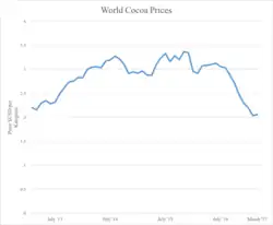 Typically, the farmers who grow the cocoa beans only receive 3.2% of the price of the final cocoa bar.[14] In Ghana and the Ivory Coast, the two largest contributors of chocolate in the world,[15] farmers will make as little $0.50 per day and the majority of their income is dependent on cocoa farming.[16] In the past thirty years, cocoa prices have been as low as $714 per ton in 2000 to as high as $3,775 per ton in spring of 2011. Although the market price of cocoa fluctuates, fair trade certification has created a minimum price for which the cocoa farmers must be paid per ton.[17] The farmers receive either the market price or the fair trade minimum, whichever is higher.[18] In January 2011, Fairtrade International (FLO) created an international standard for the minimum price fair trade cocoa farmers receive per ton of cocoa. It was increased from $1600 to $2000 per metric ton of cocoa. The minimum price set by Fair Trade ensures a consistent minimum wage for farmers. This gives farmers financial stability and the ability to plan for future events. This consumption smoothing yields to a better quality of life for the farmers and their families.