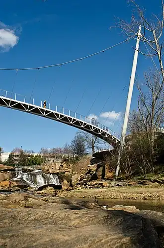 The park's most striking feature is a unique pedestrian bridge that curves around a waterfall on the Reedy River. Named the Liberty Bridge at Falls Park on the Reedy, the 355-foot (108 m) long suspension bridge is supported by cables on only one side, giving an unobstructed view of the falls. It was designed by Boston firm Rosales + Partners with German firm Schlaich Bergermann & Partner as structural engineers and completed in September 2004.[2] It was awarded the Arthur G. Hayden medal for innovative design in 2005.[3]