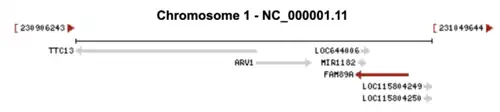 The gene FAM89A is a protein-encoding gene in humans, located on minus strand of chromosome 1, map position 1q42.2. It is also known as chromosome 1 open reading frame 153 (C1orf153).[7][8][9] The primary mRNA transcript for the FAM89A gene is 1,503 base pairs in length.[10] There are no other transcript variants for FAM89A. The gene is composed of two exons flanking one large intronic region.[11] FAM89A is neighboring the genes TRIM67 (Tripartite Motif Containing 67), located downstream of FAM89A on the plus strand of chromosome 1, and ARV1 (ARV1 Homolog, Fatty Acid Homeostasis Modulator), located upstream of FAM89A on the plus strand of chromosome 1.[11][12]