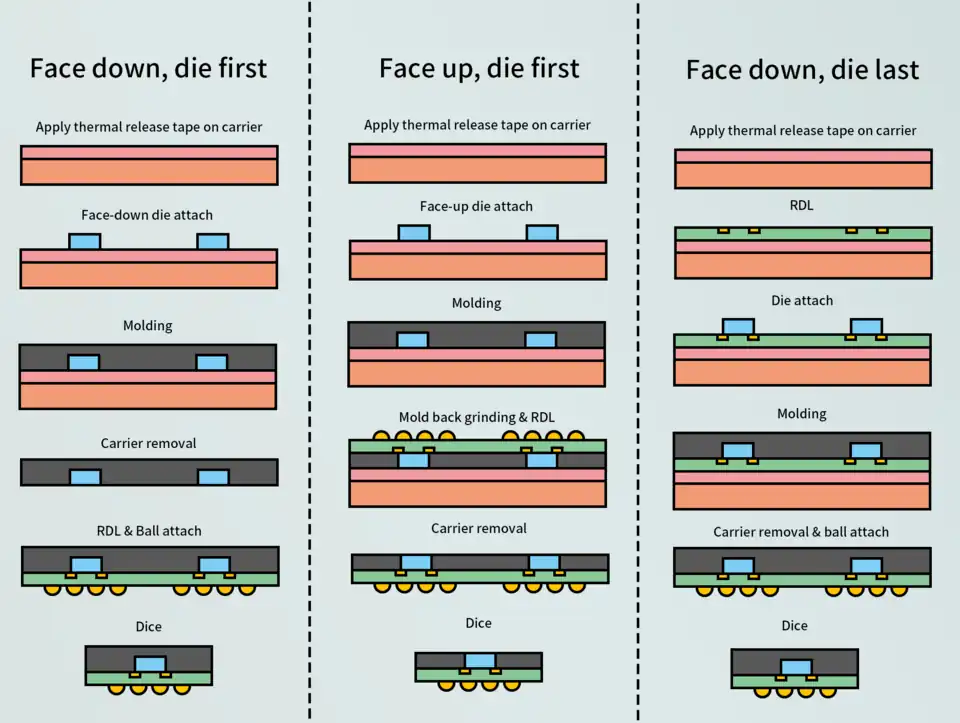 In contrast to standard WLP flows, in fan-out WLP the wafer is diced first. But then the dies are very precisely re-positioned on a carrier wafer or panel, with space for fan-out kept around each die. The carrier is then reconstituted by molding, followed by making a redistribution layer atop the entire molded area (both atop the chip and atop the adjacent fan-out area), and then forming solder balls on top and dicing the wafer. This is known as a chip-first flow. Panel level packaging uses a large panel instead of a wafer to carry out the packaging process.[6] High end fan-out packages are those with lines and spaces narrower than 8 microns.[4] Fan-out packages can also have several dies,[5] and passive components.[6] The first fan-out packages were developed by Infineon in the mid-2000s for use in mobile phone chips.[5]