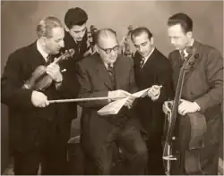1953 Baghdad Chamber Music Concert Group - Professor Julian Hertz, Piano; Vartan Manoogian 2nd violin; Professor Sandu Albu, 1st violin; Farid Allawerdi, Viola; Professor Andre Theurer, Cello.