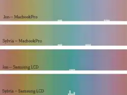 Informative subject testing done at the Rochester Institute of Technology’s Munsell Color Science Lab discovered consistent color perception difficulties when identical subjects performed the Munsell Vision Test on varying calibrated monitors in a test comparing color vision test results between Apple MacBook Pro laptop displays and a Samsung LCD Monitor.[8] Results garnered from the experiment exemplified the differences that displays can exhibit in failure to accurately quantify color. Incident angle to the test monitor is a final strong source of experimental uncertainty, as very few monitors commercially available are capable of accurately representing hue, tone and saturation consistently at all viewing angles incident to the monitor.